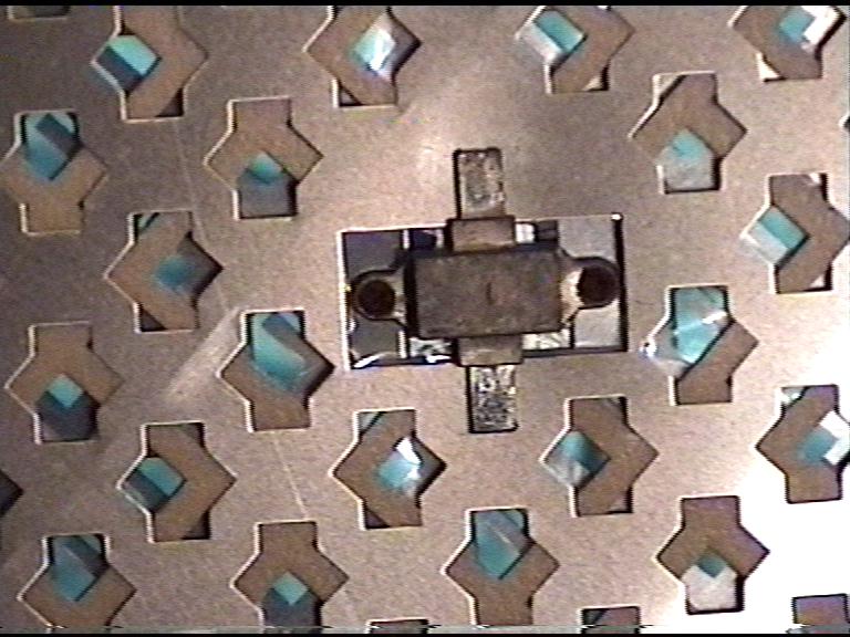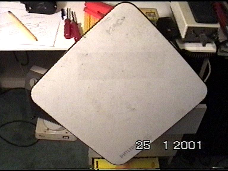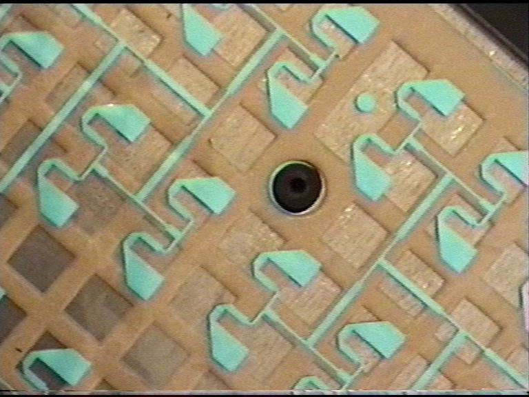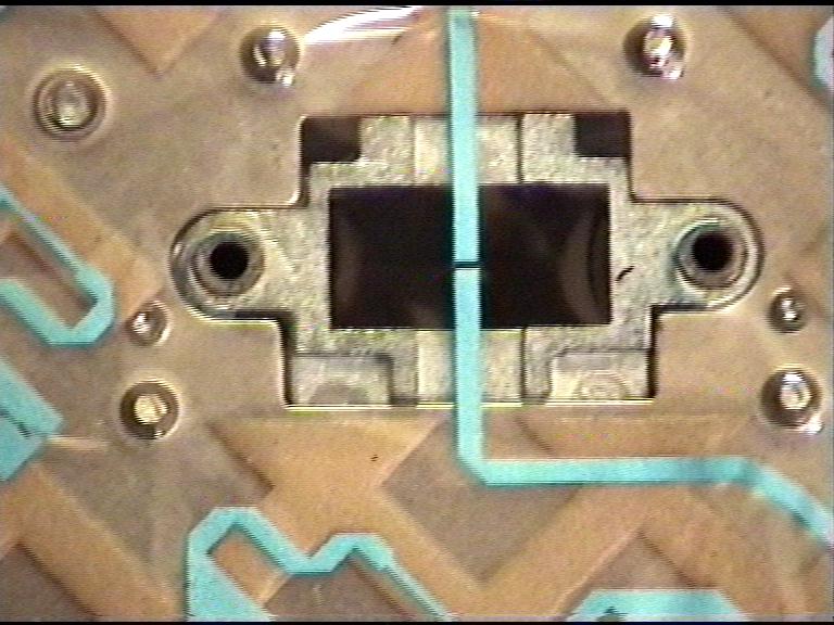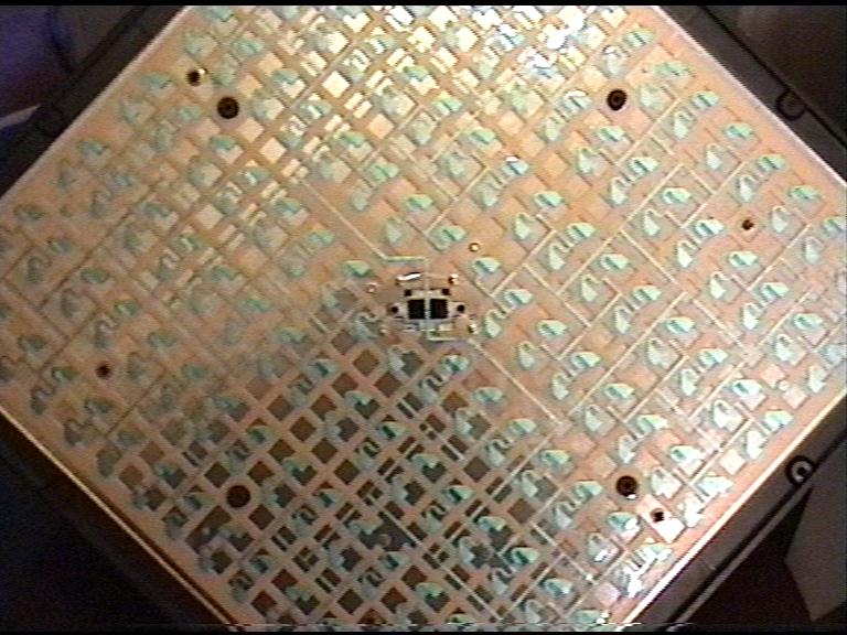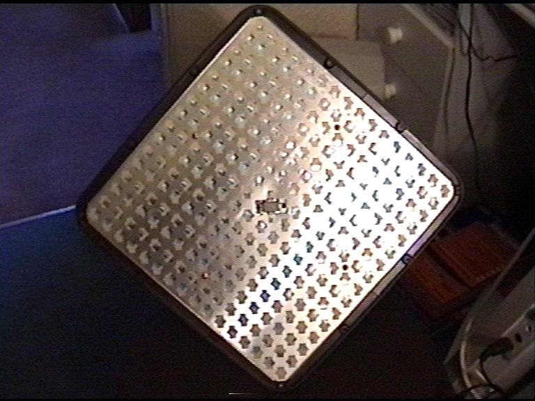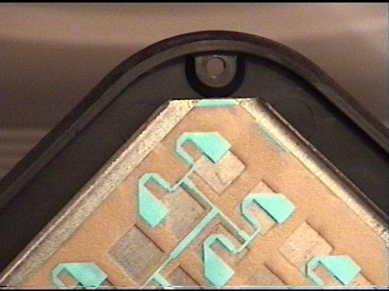 First put the BSB unit on a flat table and remove the 12 back screws as shown in picture (2) .....Then remove the screw from in the middle holding the plastic cover for the LNB....Undo the swivel mounting bracket....Unscrew the LNB itself and remove....Remove the front panel as shown in picture(3)... Next and this is the part you have to mark which was the top otherwise it will all go wrong on reassembly remove the 4 large screws holding the front plate and also the 2 screws holding the waveguide cover see picture( 4).....Remove and store all the plates and place all in the same way...Get the film with all the 256 elements on it and look at how the gap is not symmetrical its offset by a distance this is what causes one half of the system to be out of phase with the other and the result is circular polarization and no good for ATV use....The corner of this sheet has a nice piece of foil just the correct size to form a quarter wave stub that we require to glue with the wife's nail varnish (not mine) see picture (6) across the present gap....Measure along this part of the foil see picture (8) and find the central point then cut a gap the same as you had covered with a sharp knife.....Now by reassembling the whole thing back but making new holes through the different layers such that the new gap is in the center of the waveguide as before......G3RFL