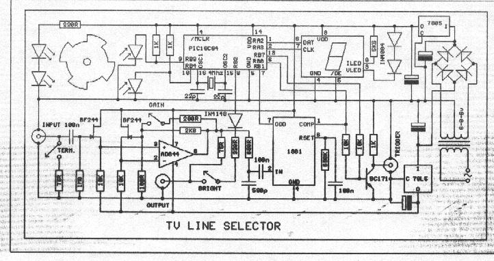 This is a really interesting Tool for anyone wanting to look at certain lines of a TV picture on an Oscilloscope. The principle is simple but very effective lets say you wanted to display line 14 only on your Oscilloscope from a PAL 625 picture I think you would find it difficult...First you need a Reference point and that is a LM1881 sync separator commonly used. That will give you ODD and EVEN frames...Next you need to Count all the lines from 1 to 625....In this clever design by G3SXC Lancs he used a PIC16C84 u/P....He used the PIC to do all the counting and gating of signals and also it feeds the LED Serial 4 Digit Display of which the MSD was read out as the letter "L" meaning line followed by the 3 digit number 001 to 625....On the front panel was a knob that sent the number required up or down and this was the optics removed from a mouse. However you could use up/down buttons if you changed the software....The Input to the unit just requires Video at the Standard level or a X10 Amplifier can be switched in at an higher impedance...There is a Video out socket that displays on the picture you fed in a bright up line that is the number displayed on the LED Display....Also a Sync pulse to trigger your Oscilloscope so you can just see that line only... This Tool really is useful when dealing with Video in a serious mode and wanting to look at certain lines only without keep playing around with the level and filters etc.... Both of us two guys have been playing around with ATV for over 37 years from flying spot scanners to home brew 405 camera's even walking portable on 70c/m Live 30 years Ago to the present days Technology. ............. G3SXC and G3RFL ....