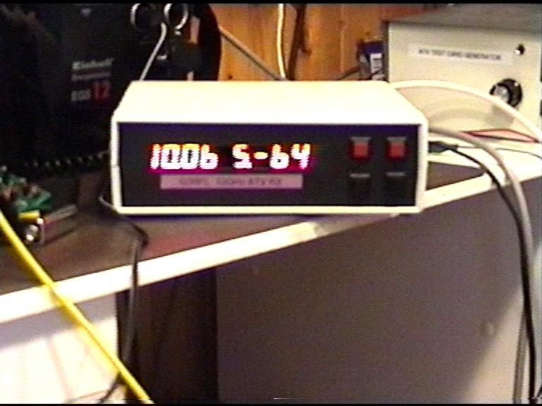 This Unit is a Comtech RX with my Software to drive the 8 Digit Display and the A/D for the "S" meter in dbm and lastly the Frequency up/down buttons.... These tune in either 125 KHz steps or 2MHz steps....The input is from an LNB that has had a 9.1GHz Puck fitted.... The Software takes care of both the LNB and IF offsets namely 9.1GHz and 480MHz so that the Display is correct. The A/D has also to input the "S" meter AGC signal and remove the 1.3Volt offset and calibrate that 4.3Volts is -30dbm....The A/D values are then converted into displayed values from -30dbm to -99dbm (No Signal )... G3RFL