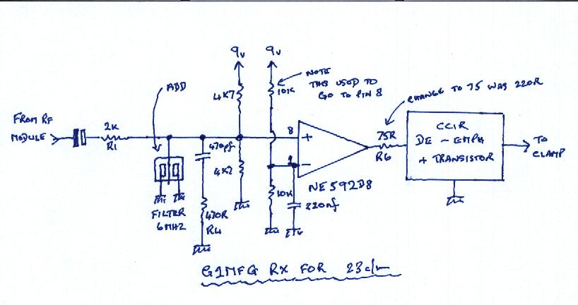 After adding the RX de-emph circuit as in CQ-TV 195 I was shocked to see all the mush coming out of the amp at first I thought it was unstable but on investigation found that it I removed the video from the TX I detected a carrier this was the 6MHz one (NOTE I had removed the 6.5MHz carrier on the TX and increased it's level to -20dbm as is standard then it matches the video when weak). I next did a plot of the removed filter parts L1 C2 L2 C3 and this helps to remove the sound carrier by -15db. I was seeing about 450m/V of carrier and was upsetting the syncs. Just adding a Cap does drop it but upsets the Colour burst and the higher vision frequencies as well. So I sat and thought could we use a 6MHz filter but put it in shunt mode on the input of the NE592 Amp and yes it worked. I had tried to place it in the feedback of the amp but it took off and was very unstable. I did try this in all modes and the best was as shown below. I finished up with a clean signal and was left with just the correct gain level to sort out and the LINE 50% LF DROOP PROBLEM and this is in the RX not the TX. I noticed an error in the Figure 1 of CQ-195. The biasing to the NE592 on pin 1 they have potted down half the voltage from pin 8 ? The input will not work with a DC differential 2V Voltage Below is how it should be done (Also see my new way of biasing this amp to stop LF distortion.)