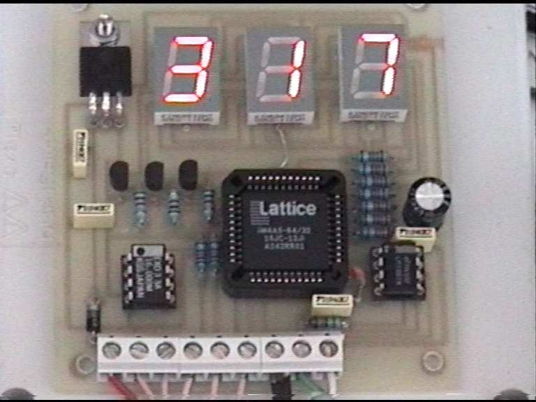 I used a ispMACH4 44pin PLCC device that now has a 3 decade line counter a 3 decade position counter and a 12 bit comparator....Also decodes the 3 decade position counter into 3 X 7 segment LED MUX drivers....